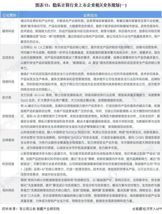 从业务规划来看,隐私计算上市公司纷纷规划技术创新与业务拓展,涵盖智慧政务、信息安全、AI与大数据、智慧城市等多个领域,旨在提升产品竞争力、拓展市场份额,并通过AI、密码技术等前沿技术推动业务高质量发展。我国隐私计算主要上市企业业务规划如下: