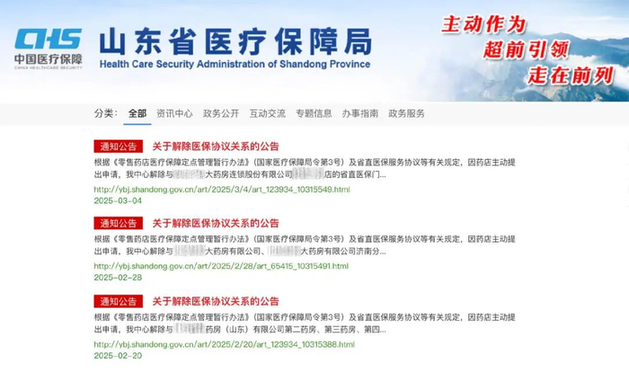 赛柏蓝检索发现,山东省医保局近期发布了多起由药店主动申请而解除门诊统筹药店医保协议关系或“双通道”药店的医保协议关系的公告,均为上市医药企业旗下门店。