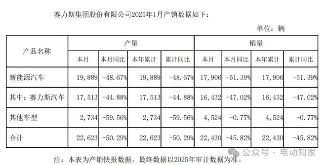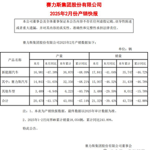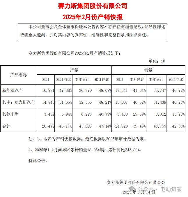 电动知家消息,3月13日晚,赛力斯发布2025年2月产销快报,公司2月汽车销量21329辆,同比下降39.43%。其中,新能源汽车销量为17,841辆,同比下降41.04%。2025年1-2月合计销量43759辆,同比下滑42.88%。