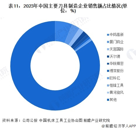 根据国内刀具制造行业上市企业披露的销售额数据,2023年,中钨高新的刀具销售额占国内销售市场的比重超过6%,位居行业领先地位;其次是厦门钨业、天宫国际等企业。整体来看,国内刀具行业呈现充分竞争态势,国内企业整体市占率较低。