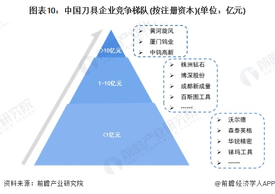 近几年,国内以中钨高新、厦门钨业、欧科亿等为代表的领先刀具制造商正不断加大科研投入,努力推动产业高端化发展,致力于加速刀具国产化进程。根据刀具企业的注册资本划分,可分为3个竞争梯队。其中,注册资本大于10亿元的企业有厦门钨业、中钨高新、黄河旋风;注册资本在1-10亿元之间的企业有株洲钻石、博深股份、成都新成量、百斯图工具等重点企业;而沃尔德、森泰英格等企业的注册资本均在1亿元以下。