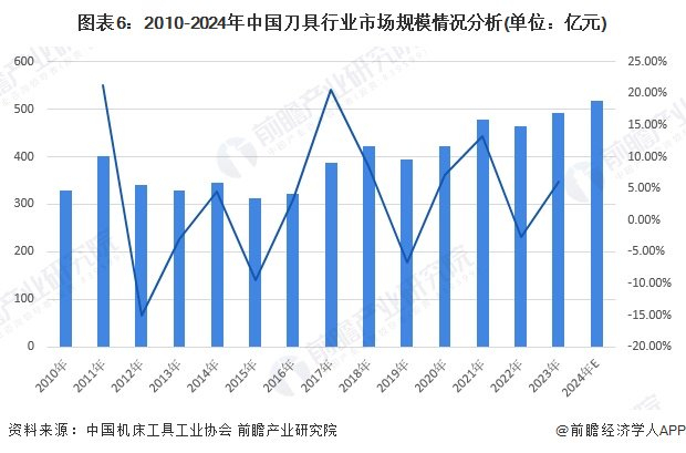 中国刀具行业市场规模在2010年至2023年间呈现波动增长。2010年市场规模为330亿元,随后在2011年达到400亿元。市场经历了一些波动,如2012年和2015年分别下降了15%和10%,但在2017年重新回升,并在2021年实现新的突破。2023年中国刀具行业市场规模达到492亿元,增速为6.12%。初步统计2024年市场规模突破500亿元。整体来看,刀具行业在波动中呈现持续增长趋势。