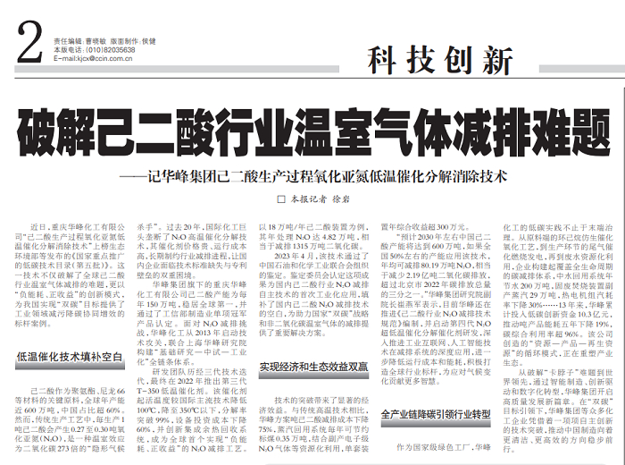 近日,重庆华峰化工有限公司“己二酸生产过程氧化亚氮低温催化分解消除技术”上榜生态环境部等发布的《国家重点推广的低碳技术目录(第五批)》。这一技术不仅破解了全球己二酸行业温室气体减排的难题,更以“负能耗、正收益”的创新模式,为我国实现“双碳”目标提供了工业领域减污降碳协同增效的标杆案例。