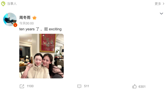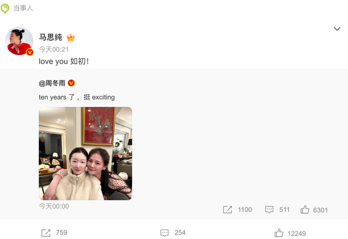 3月14日零点整,周冬雨晒照,为马思纯庆36岁生日,并配文“ten years了 ,挺 exciting”。纪念两人间十年的友谊。
