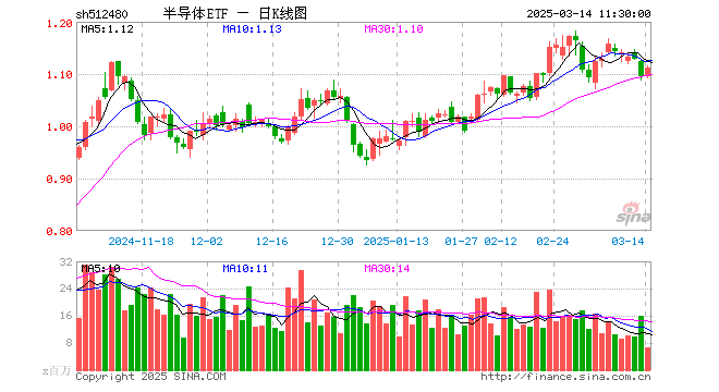 3月14日,截止午间收盘,半导体ETF(512480)涨1.55%,报1.112元,成交额7.42亿元。半导体ETF(512480)重仓股方面,中芯国际截止午盘涨2.42%,海光信息涨1.02%,寒武纪涨2.89%,北方华创涨2.15%,韦尔股份涨1.90%,中微公司涨1.83%,澜起科技涨1.54%,兆易创新涨3.23%,长电科技涨1.58%,紫光国微涨0.84%。