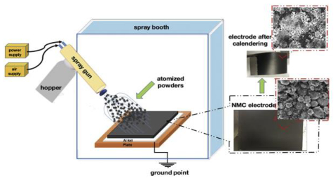 静电喷涂法是干法电极制备工艺中的一种重要技术,其核心在于利用高压气体将活性材料、粘结剂和导电剂颗粒充分混合后,通过静电喷枪使粉末带负电荷,并将其精准地喷涂到带正电荷的金属箔集流体上。随后,喷涂完成的电极经过热压处理,粘结剂在高温下融化并与其他粉末形成牢固的结合,最终挤压成具有良好粘结性和机械稳定性的自支撑膜。