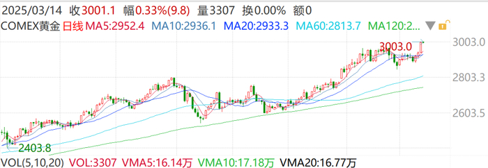 截至3月14日早上,COMEX黄金期货涨穿3000美元/盎司关口,现货黄金价格也涨至2989美元/盎司上方,均为历史首次。