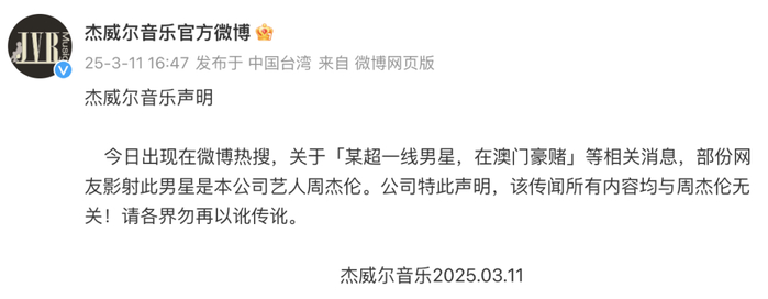 3月11日下午,杰威尔音乐官方微博发布声明:该传闻所有内容均与周杰伦无关,请各界勿再以讹传讹。