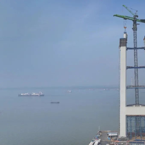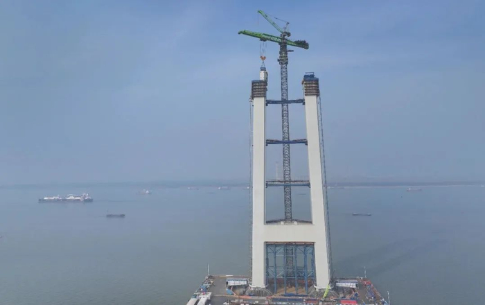张靖皋长江大桥南航道桥南主塔高350米,塔柱划分为30个节段,内设4根直径3.6米的钢管约束混凝土柱,节段像搭积木式的层层叠加向上安装,采用工厂化制造、现场装配化施工。