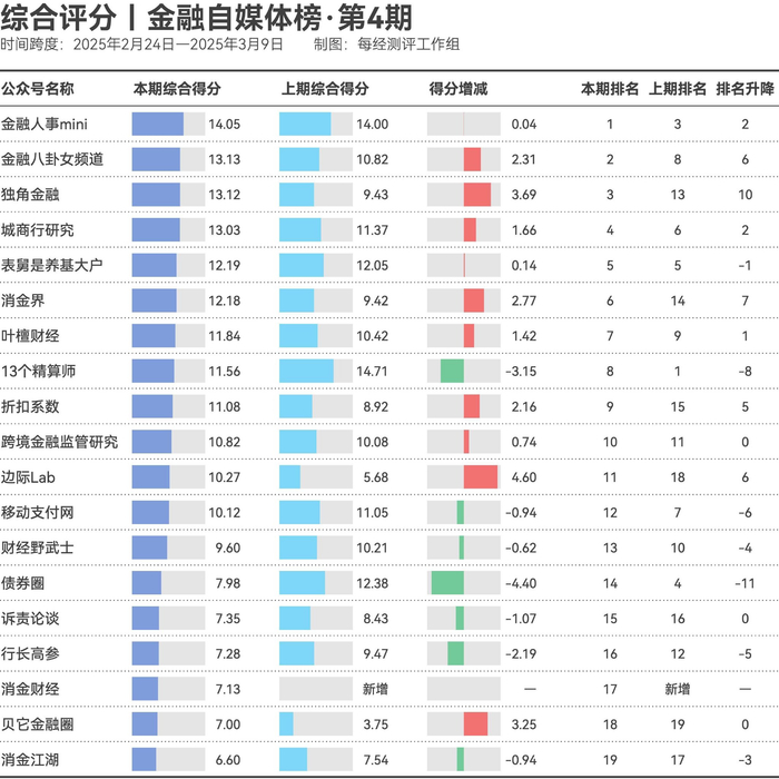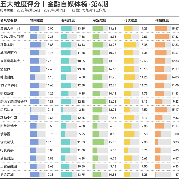 榜单上的金融自媒体竞争激烈。与上期相比,综合得分显示,“金融人事mini”“表舅是养基大户”表现稳定,保持前五名。“独角金融”成为榜单中的“黑马”,从上期的第13名跃升至第3名。“13个精算师”和“债券圈”虽然上期位于前5名,但本期排名有所下降。