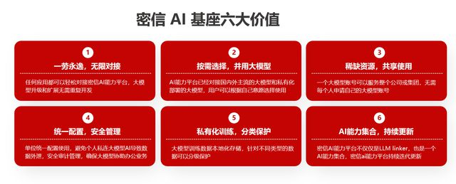 更为重要的是,“密信AI基座”作为一款通用应用平台,通过集成DeepSeek与百度文心、kimi、阿里通义等头部模型,还有多种开源大模型,包括翻译,TTS,STT,语种识别,语言大模型等,快速集成对接私有化,通过AI基座可以为第三方应用提供大模型的统一标准化接口,减轻应用的适配开发工作量,推动AI能力从技术储备转化为商业价值的“最后一公里”被打通。