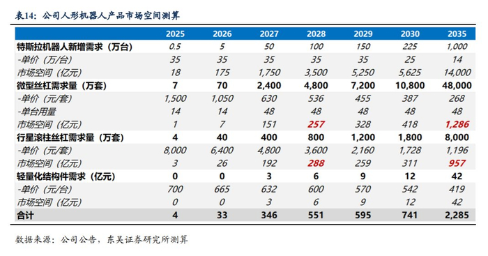 狄兹精密具备微型丝杠加工能力,技术实力领先。公司率先在国内掌握直径3mm及以下的滚珠丝杆的C1级精密加工工艺,并具备1.4mm直径微型滚珠丝杆量产能力,机器人灵巧手所需的3-5mm工艺已可成熟应用。此外,狄兹精密具备行星滚柱丝杠、直线驱动关节等产品加工能力,预计产品矩阵将进一步拓展,2035年市场空间预计达2000亿元左右。