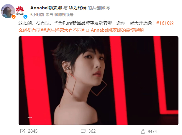 3月14日,@华为终端 发布新品宣传视频,华为“二公主”姚安娜作为华为Pura新品品牌挚友出镜。