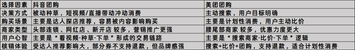 抖音团购更倾向于头部连锁、网红店和明星商家,依靠品牌影响力+内容传播,让用户在“无感知状态”下完成消费决策。而美团团购则更具计划消费属性,其搜索+比价逻辑更适合腰尾部商家,满足消费者的日常刚需。两者分别围绕“兴趣驱动”和“需求驱动”展开竞争,形成了互补但各自占据不同市场心智的新格局。