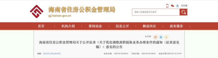 海南省住房公积金管理局发布关于公开征求《关于优化调整离职提取业务办理条件的通知(征求意见稿)》(以下简称《征求意见稿》)意见的公告,拟优化调整离职提取住房公积金业务的办理条件。