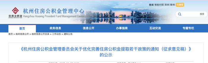 杭州住房公积金管理委员会发布《关于优化完善住房公积金提取若干政策的通知(征求意见稿)》。
