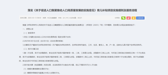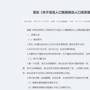 3月13日,呼和浩特市卫生健康委员会宣布,对于今年3月1日之后(含3月1日)合法生育,且新生儿首次落户在该市的家庭,将予以育儿补贴。