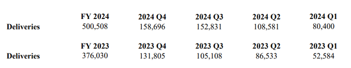 交付量上,理想第四季度交付量158696辆,同比增长20.4%,略低于预期;2024年理想汽车交付量达500508辆,同比增长了33.1%。