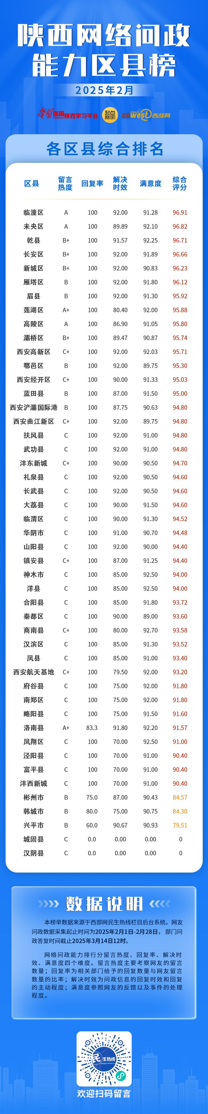 西部网讯(记者 辛超 裴丰瑶) 2025年2月,西部网民生热线与陕西47个区县(开发区)进行了网络问政沟通对接。根据各区县(开发区)留言热度、回复情况和网友满意度的综合评定,西安临潼区、西安未央区、咸阳乾县分别以总分96.91、96.82、96.71位列网络问政能力2月区县榜前三名。