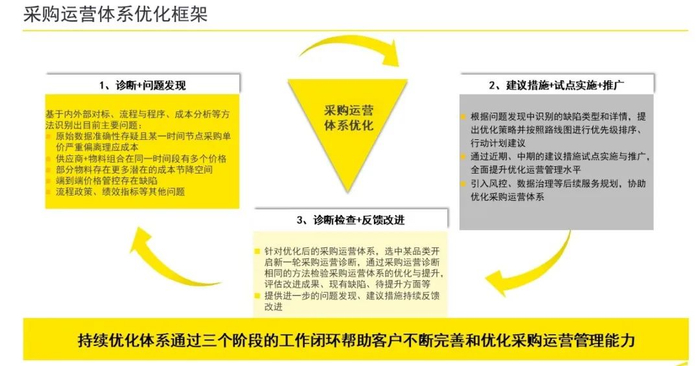 鉴于采购中存在的降本空间,本次项目从客户采购运营数据出发,从供应商、子品类、关键物料等维度,分析物料随时间的价格变动情况,初步测算成本优化空间;同时建立“诊断—实施推广—反馈改进”采购运营体系优化框架,通过三阶段的工作闭环帮助客户不断完善和优化采购运营管理能力。