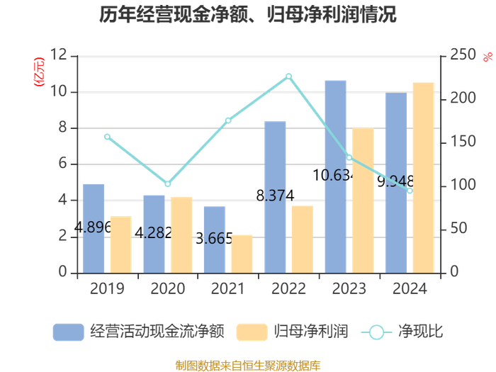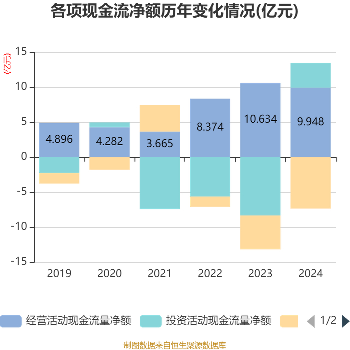 截至2024年,公司经营活动现金流净额为9.95亿元,同比下降6.45%;筹资活动现金流净额-7.33亿元,同比减少2.49亿元;投资活动现金流净额3.54亿元,上年同期为-8.32亿元。
