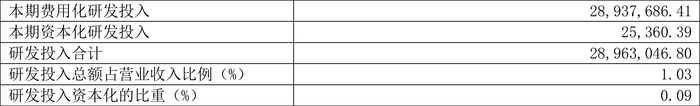 2024年全年,公司研发投入金额为2896.3万元,同比增长66.56%;研发投入占营业收入比例为1.03%,相比上年同期上升0.48个百分点。此外,公司全年研发投入资本化率为0.09%。