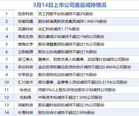 3月14日消息,据统计,截至发稿,只有一家上市公司海天股份披露增持情况。迅安科技、安徽凤凰、花溪科技、美农生物、渤海化学、立新能源、浙江美大、多伦科技、甘李药业、汇川技术、怡合达、优刻得、派能科技、长青科技等14家公司披露减持情况。