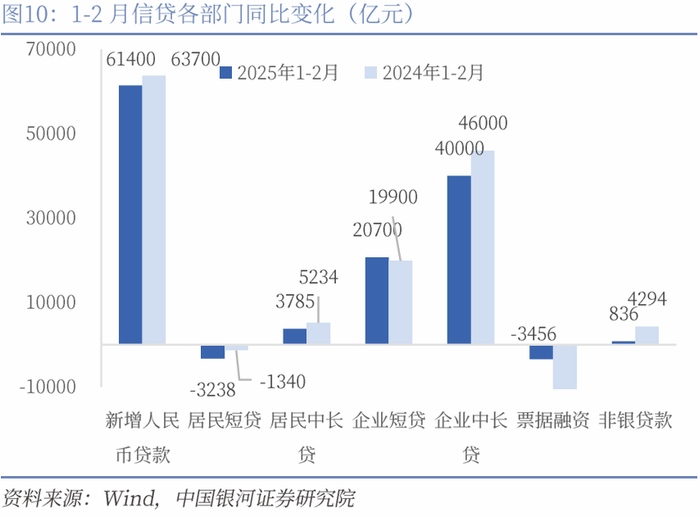 从1-2月累计数看,在直接融资表现偏强的同时,对实体新增信贷略高于去年同期,但票据冲量更为明显。由于春节的季节性扰动和需求可能被前置的影响,我们认为从1-2月累计数来观测信贷可以排除噪音,更有参考意义。1-2月企业直接融资(股票+债券)与去年基本持平。1-2月金融机构累计新增人民币贷款6.14万亿元,同比少增2300亿元。同比少增主要受到非银贷款的拖累,同比少增3458亿元。对实体部门贷款则实现同比多增500亿元。其中,居民表现弱于去年,同比少增3347亿元,居民短贷和中长贷均弱于去年同期;企业虽然呈现同比多增,但是主要靠票据融资拉动,中长期贷款表现偏弱,同比少增6000亿元。政府项目投资对企业中长期贷款的拉动作用可能弱于去年同期。