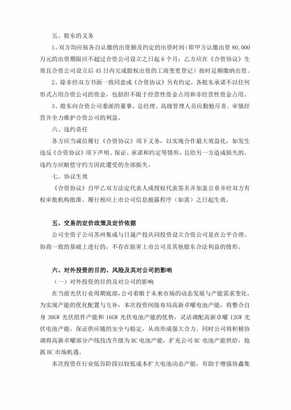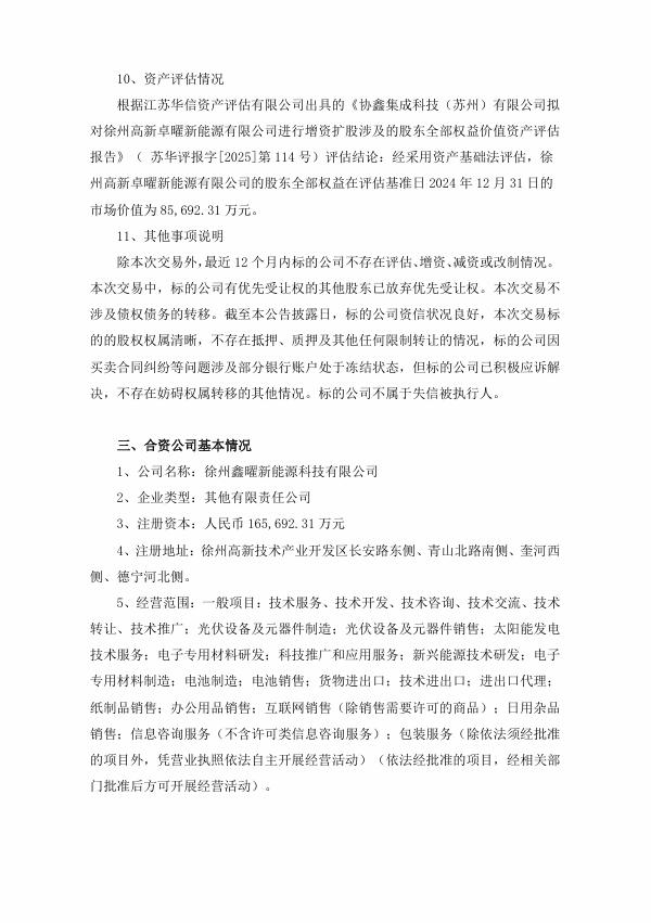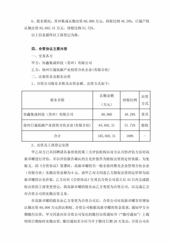 根据公告,鑫曜新能源的注册资本为人民币165,692.31万元,其中苏州集成将以自有资金认缴出资人民币80,000万元,持有48.28%的股权;日晟低碳则以其持有的徐州高新卓曜新能源有限公司(简称“卓曜新能源”)90.9570%的股权认缴出资人民币85,692.31万元,持有51.72%的股权。此次合作中,卓曜新能源的股权和资产将被注入到鑫曜新能源中,具体公司名称将以最终市场监督管理部门登记为准。