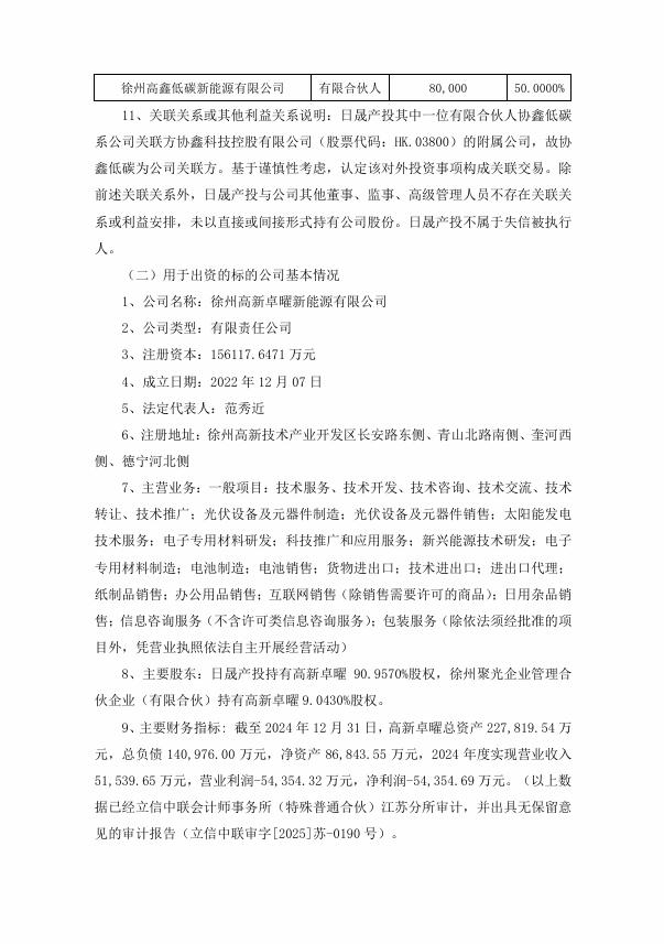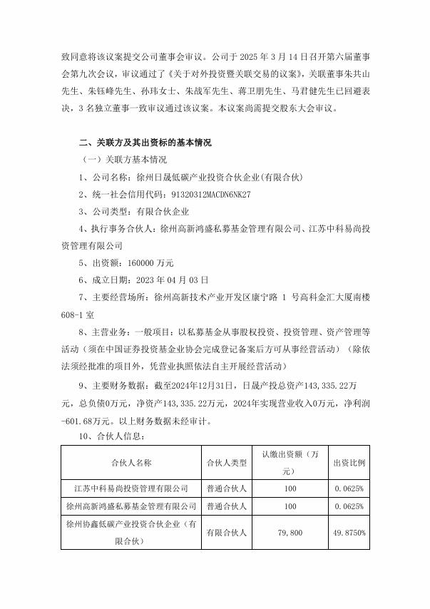 3月14日,协鑫集成科技股份有限公司发布了关于对外投资暨关联交易的公告,宣布其全资子公司协鑫集成科技(苏州)有限公司(简称“苏州集成”)拟与徐州日晟低碳产业投资合伙企业(有限合伙)(简称“日晟低碳”)共同投资成立徐州鑫曜新能源科技有限公司(简称“鑫曜新能源”)。
