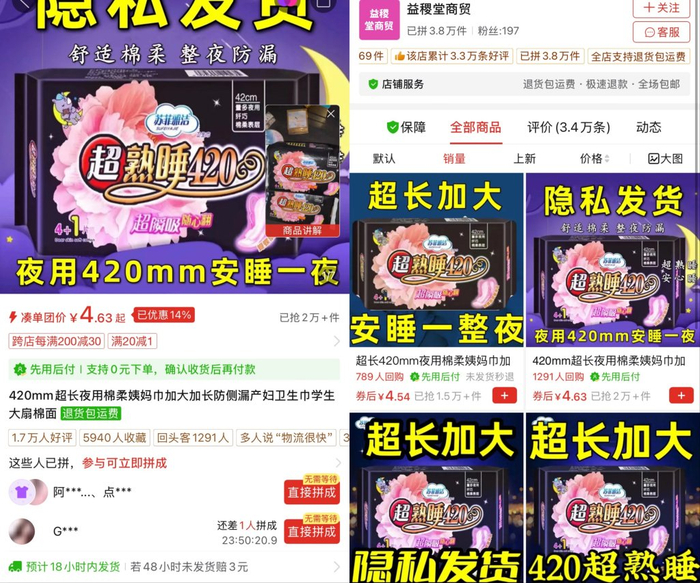 张青称,这两款都在前述平台的部分团购社区内出售,该工厂目前的发货量是一天一辆9米6货车的货品。张青建议,可以先卖“苏菲雅洁”超熟睡420夜用加长款,“销量最好”,或直接卖上述组合装。