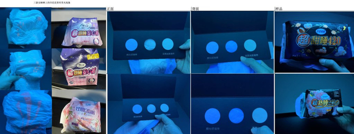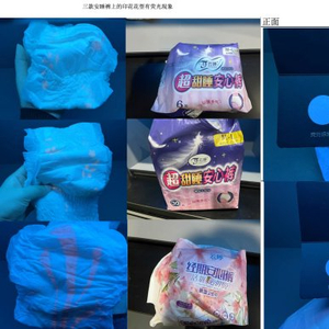 记者同样将这6款产品送检。初步结果显示,标称为“七度空间少女系列超薄款日用245mm规格(10片装)”和标称为“宝宝淌吧超薄透气夜用290mm规格(5片装)”两款产品的底胶,检出有荧光增白剂的存在,且荧感明显。检测时工作人员发现,标称为“七度空间少女系列超薄款日用245mm规格(10片装)”的产品,拆开后每片包装都不同,且有多片存在大量黑点、不明污渍等问题,不符合GB/T 8939—2018的规定,为不合格产品,正待进一步检测微生物、PH值等其他指标。