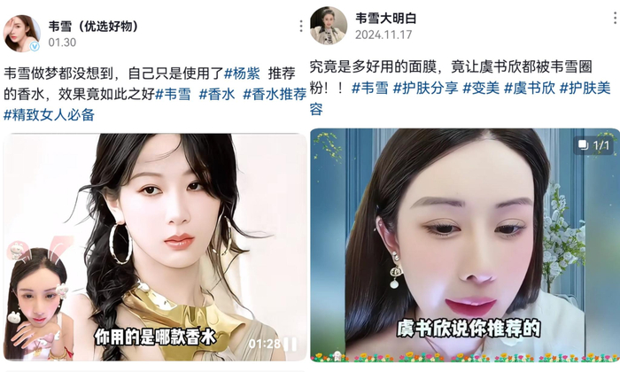 典型例如不少账号在推荐胶原蛋白灌注面膜时,便通过嫁接韦雪内容和虞书欣的面膜种草视频,将艺人完全不同的带货内容移植至短视频内。就连韦雪团队旗下的短视频账号,也会搭载毫无关联的女艺人视频和照片,辅助使用后“女明星集体回春”等表达。