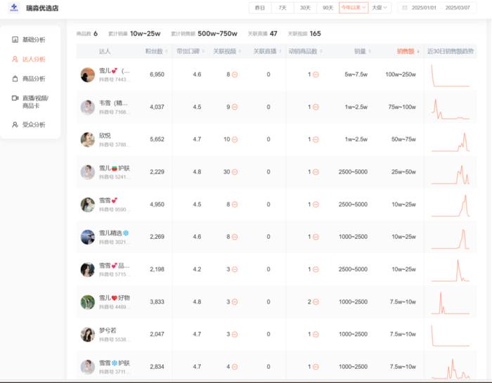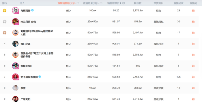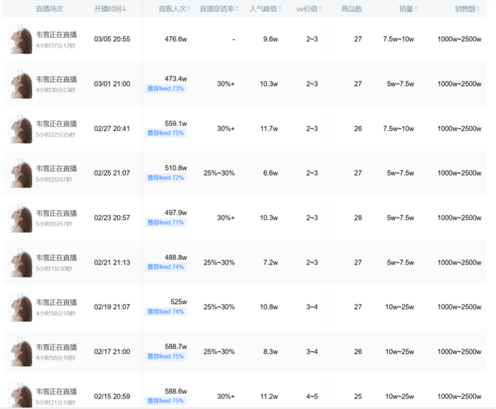 这个从去年9月起,依靠“清醒女人情感语录”和个人恋爱故事迅速走红的初代网红完成了在直播间的三级跳。据蝉妈妈数据,从去年10月起韦雪直播间月GMV均在亿元以上,3月第一周两场直播下来,其累计销售额也突破2500万,在达人带货榜中排名第8。