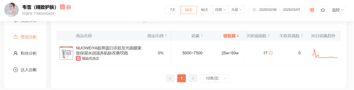 剁椒Spciy查询蝉妈妈发现,过去一个月,韦雪相关切片素材账号带货金额在1万元以上的有144人,10万元以上的为23人。视频带货销售额TOP10中,大量账号均为雪映繁星、三只羊的签约账号,许多仅在万粉左右,甚至只有7000粉丝。
