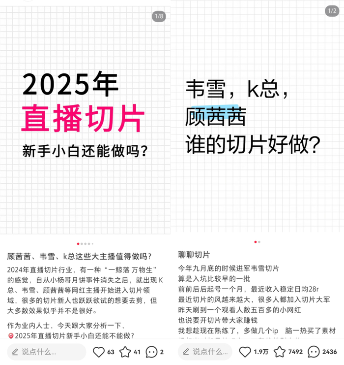 一方面是大量切片剪辑、素材包博主不断售卖韦雪的直播录屏资源,呼吁有兼职需求的用户做韦雪切片“躺着挣钱”,另一方面,不乏个人号在小红书感慨:“做韦雪切片一个月了还没达到千粉,没法挂链接”、‘挂链成功但是不出单,卖不了货,韦雪太难做了!”