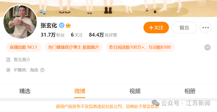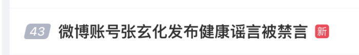 3月15日,话题#微博账号张玄化发布健康谣言被禁言#冲上微博热搜。