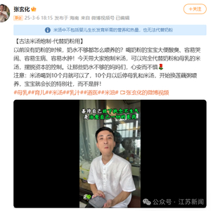 经站方巡查发现,用户@张玄化 多次发布所谓“米汤代替奶粉”等无相关科学依据的内容,感谢热心网友添加的附注,站方也对相关内容进行了打签说明。