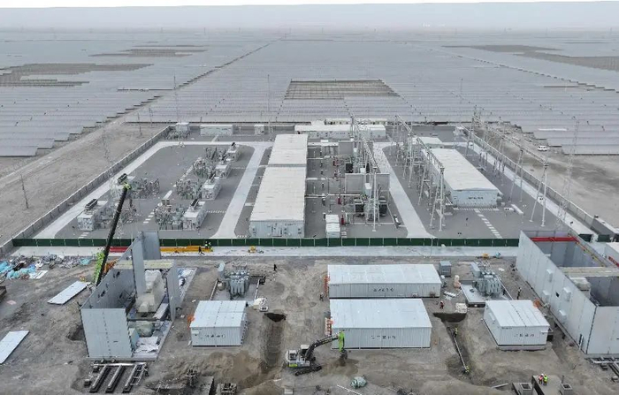 在总投资110亿元的全国单体容量最大“沙戈荒”光伏项目——中绿电若羌400万千瓦光伏项目220千伏升压汇集站施工现场,工人们正在进行调相机设备安装工作。