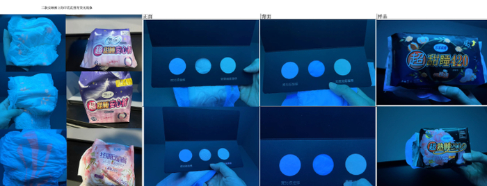 3月上旬,记者赴郯城县暗访,该款卫生巾的授权生产厂家相关负责人徐某梦自曝“做假货起家”,称可以代加工低劣卫生巾,原料存在荧光剂超标等问题。他还称,只要产品质检报告显示合格,绝大多数人都发现不了。记者从其工厂拿的样品中,有5款产品检出荧光增白剂的存在,荧光明显。