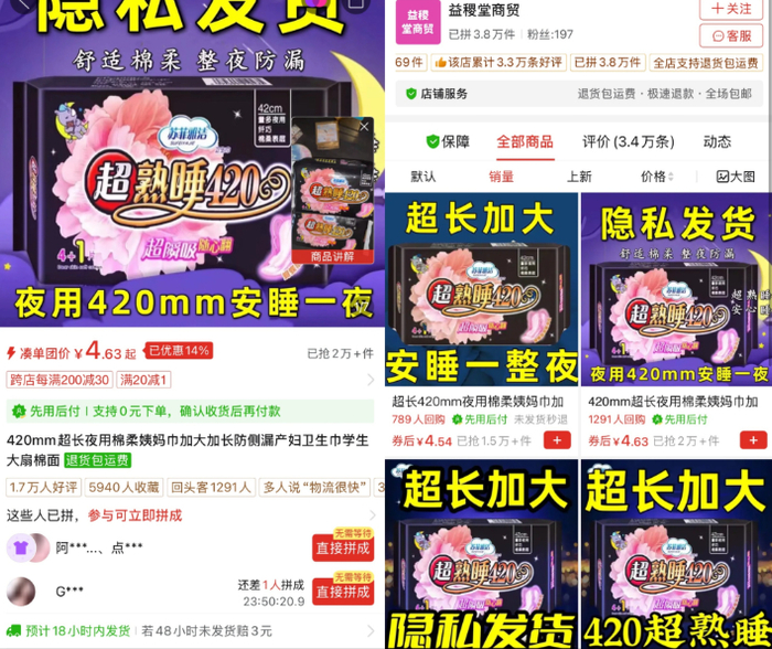 张青称,这两款都在前述平台的部分团购社区内出售,该工厂目前的发货量是一天一辆9米6货车的货品。张青建议,可以先卖“苏菲雅洁”超熟睡420夜用加长款,“销量最好”,或直接卖上述组合装。