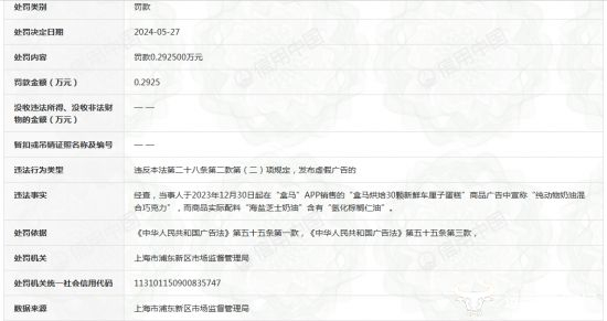值得一提的是,近些年来,盒马鲜生因违法违规被罚事项不少,在去年5月27日时,其还曾因发布虚假广告被罚将近3000元。