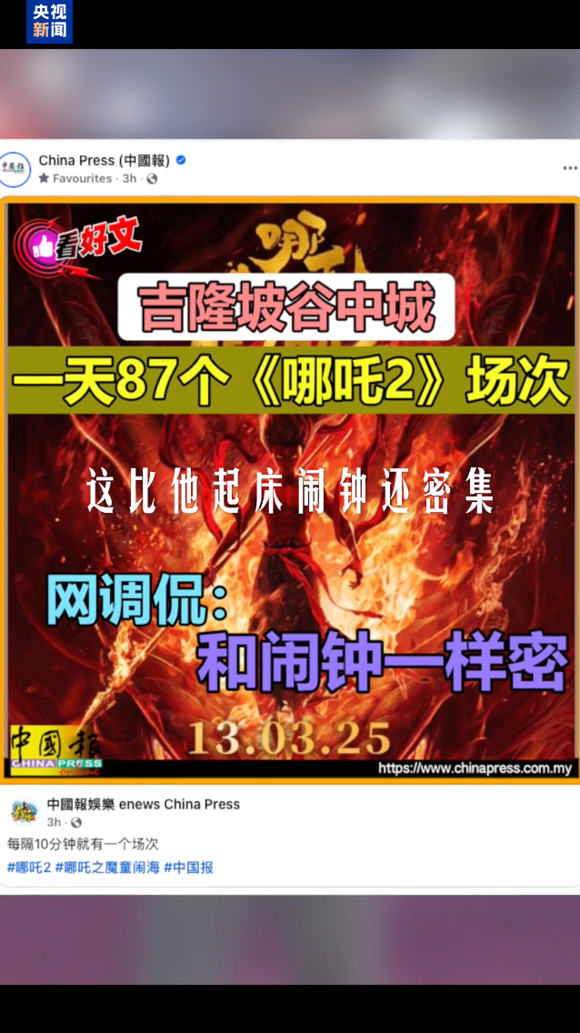 当地时间3月13日,《哪吒2》在马来西亚全国范围146所影院正式上映。“请假看电影”“飞奔上厕所”“诚意满满”“排片堪比起床闹钟”……这是马来西亚观众观看《哪吒2》的体验和评价。