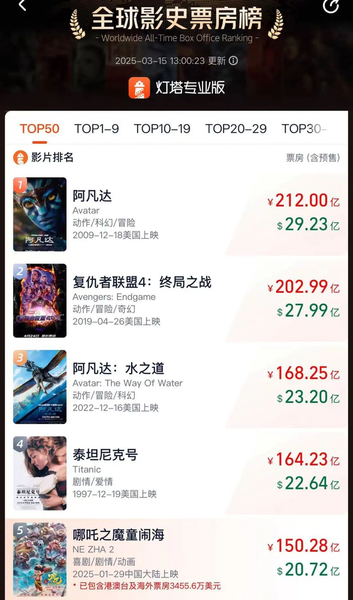 3月15日,据网络平台数据,《哪吒之魔童闹海》(以下简称“哪吒2”)全球电影票房(含预售及海外)超越《星球大战:原力觉醒》进入全球票房榜前5名。