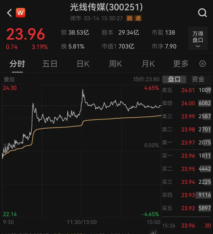 3月14日,光线传媒股价继续回升,截至当日收盘涨3.19%,报23.96元,总市值703亿元。