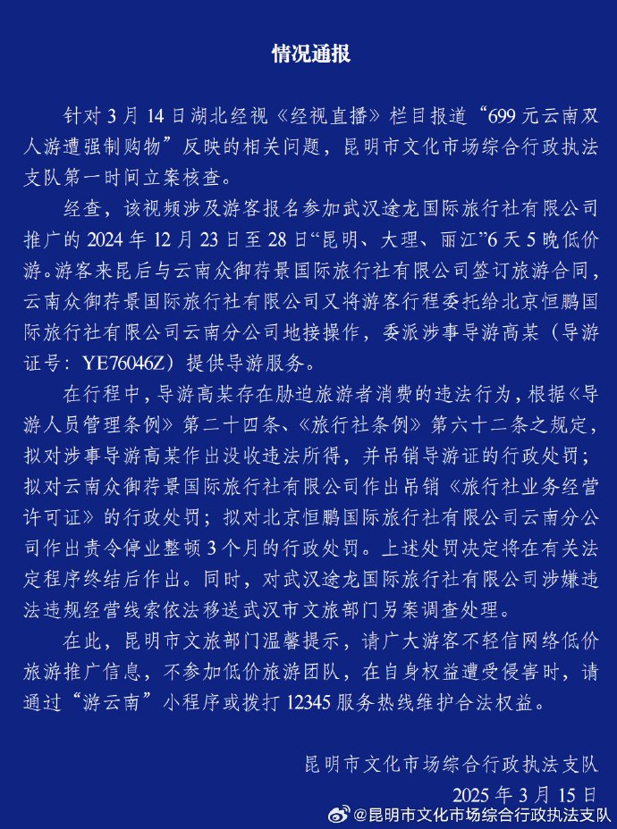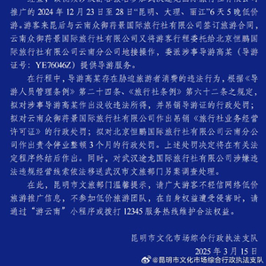 昆明市文化市场综合行政执法支队3月15日通报,经查,网传视频涉及游客报名参加武汉途龙国际旅行社有限公司推广的2024年12月23日至28日“昆明、大理、丽江”6天5晚低价游。游客来昆后与云南众御荇景国际旅行社有限公司签订旅游合同云南众御荇景国际旅行社有限公司又将游客行程委托给北京恒鹏国际旅行社有限公司云南分公司地接操作,委派涉事导游高某提供导游服务。