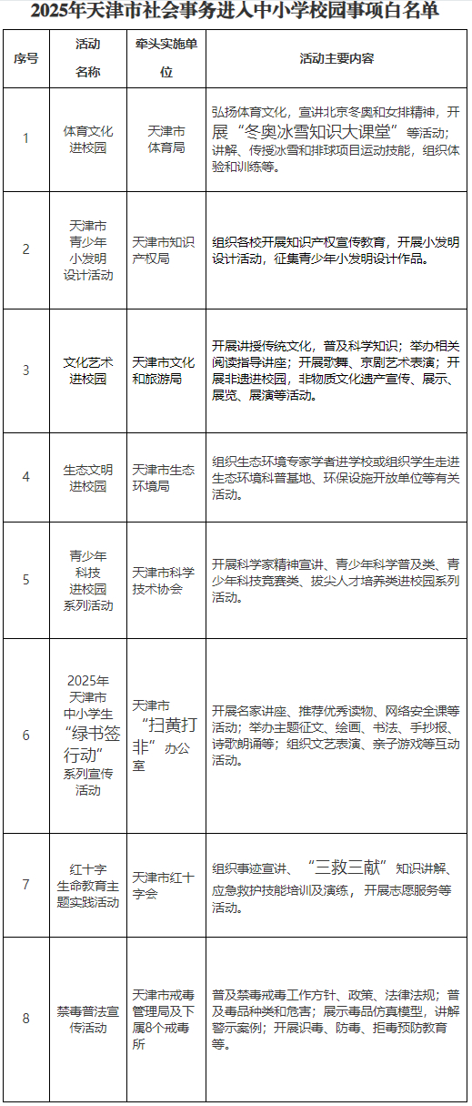 为切实减轻中小学教师非教育教学负担,进一步营造教育教学良好氛围,市教委面向市有关部门征集了2025年天津市社会事务进入中小学校园事项,制定了《2025年天津市社会事务进入中小学校园事项白名单》,现予公布。