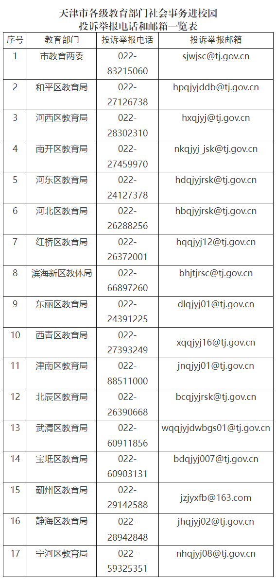 为充分发挥社会监督作用,畅通师生、家长等投诉举报途径,同步向社会公布我市和各区社会事务进校园投诉举报电话和邮箱。投诉举报要求有具体线索材料,以个人名义反映的应实名,单位提出的,应明确具体联系人和联系方式。