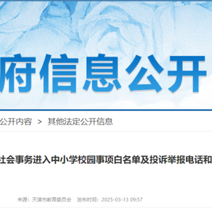 日前,天津市教委网发布《关于公布2025年天津市社会事务进入中小学校园事项白名单及投诉举报电话和邮箱的公告》,明确了2025年天津市社会事务进入中小学校园事项白名单和投诉举报方式。