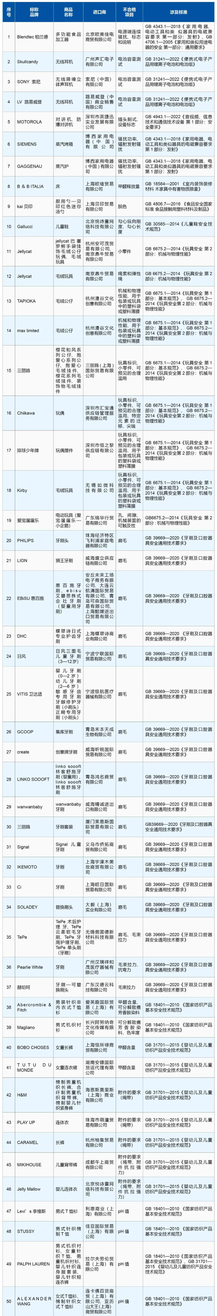 3月14日,海关总署对2024年检出的进口“洋品牌”消费品质量安全不合格100个典型案例进行通报。不合格情况包括进口小家电电池容量测试、电器辐射发射项目不合格;进口玩具机械和物理性能、小零件项目不合格;进口服装甲醛含量、可分解致癌芳香胺染料超标;进口家具甲醛释放量超标;进口牙刷磨毛不合格等。